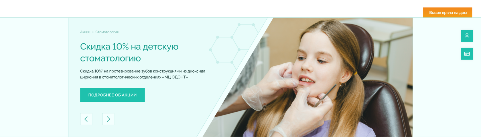 Большое внимание уделили навигации по сайту, продумали двухуровневую шапку сайта: первый уровень содержал логотип, поиск, номера телефонов, кнопки «Адреса клиник», «Личный кабинет» и кнопку записи на приём.