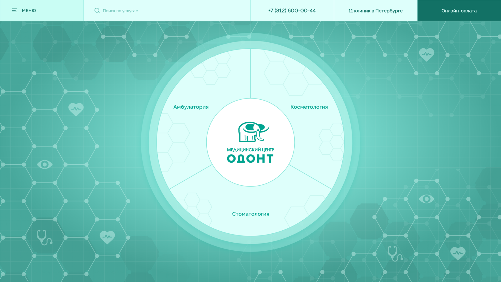 Вторую дизайн-концепцию мы обыграли через круг — он же буква из наименования «О» (Одонт). Круг мы разделили на три части — главные подразделения клиники, а по центру находится логотип клиники.