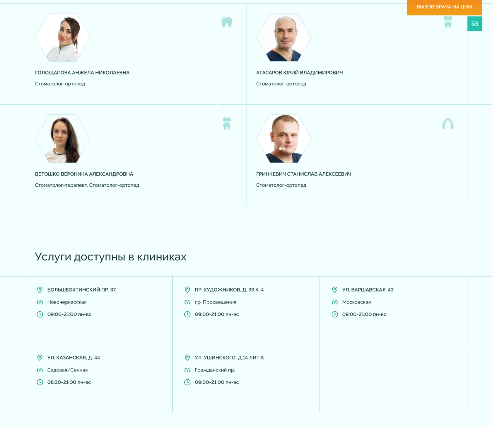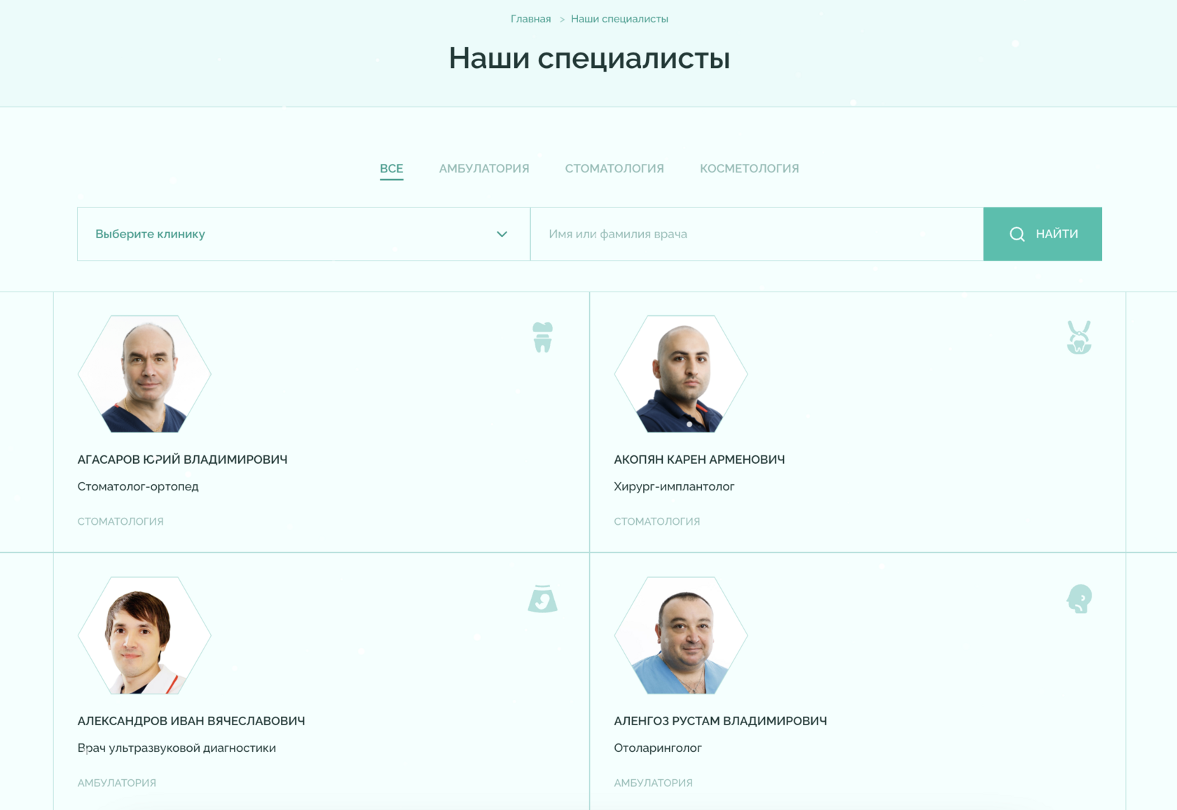 На странице с врачами предусмотрена фильтрация по трём подразделениям клиники, а также по адресам, где принимают специалисты. Можно быстро найти нужного врача по имени или фамилии.