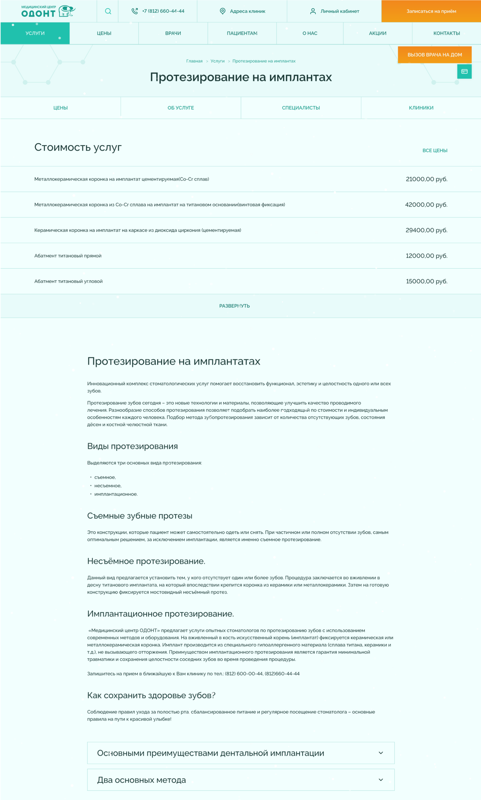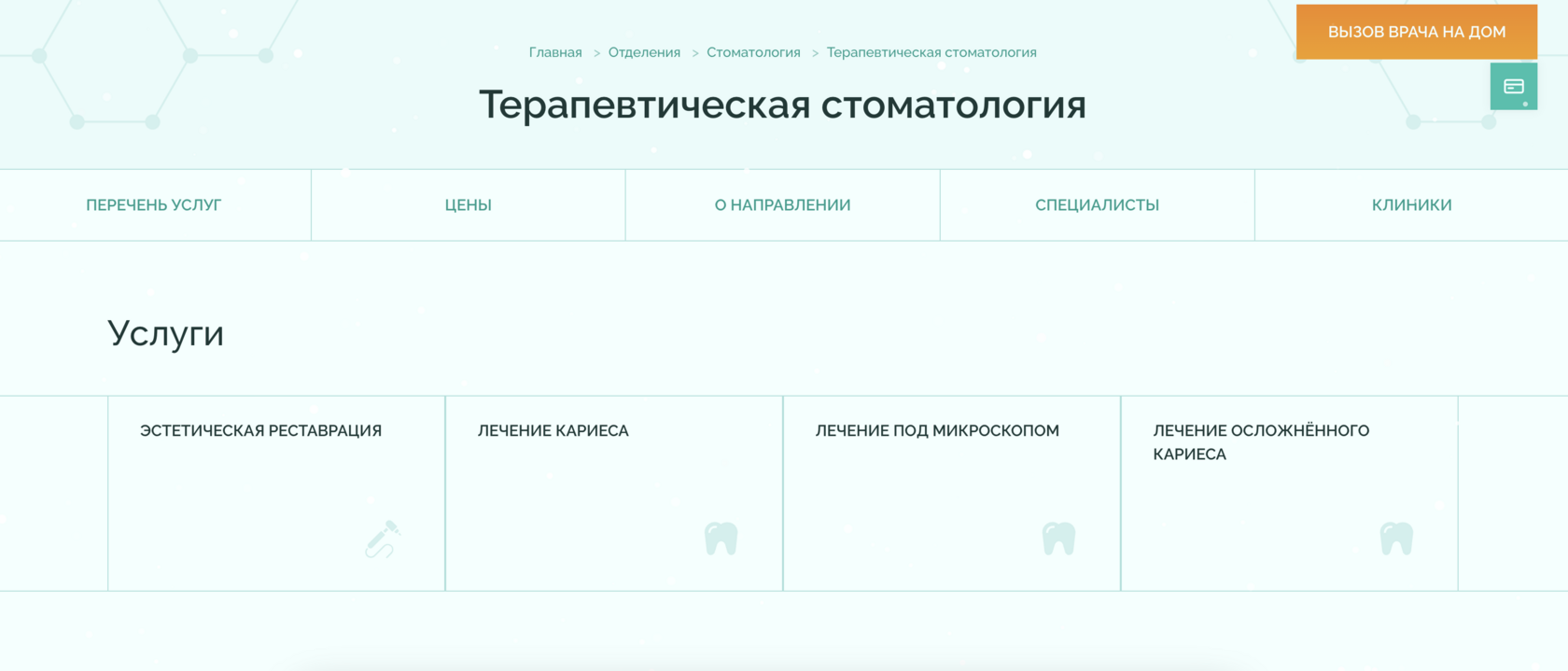 Так выглядит страница направления — здесь мы отразили перечень контентных страниц с услугами, список цен на все услуги и врачей направления, а также адреса клиник, в которых оказываются данные услуги.