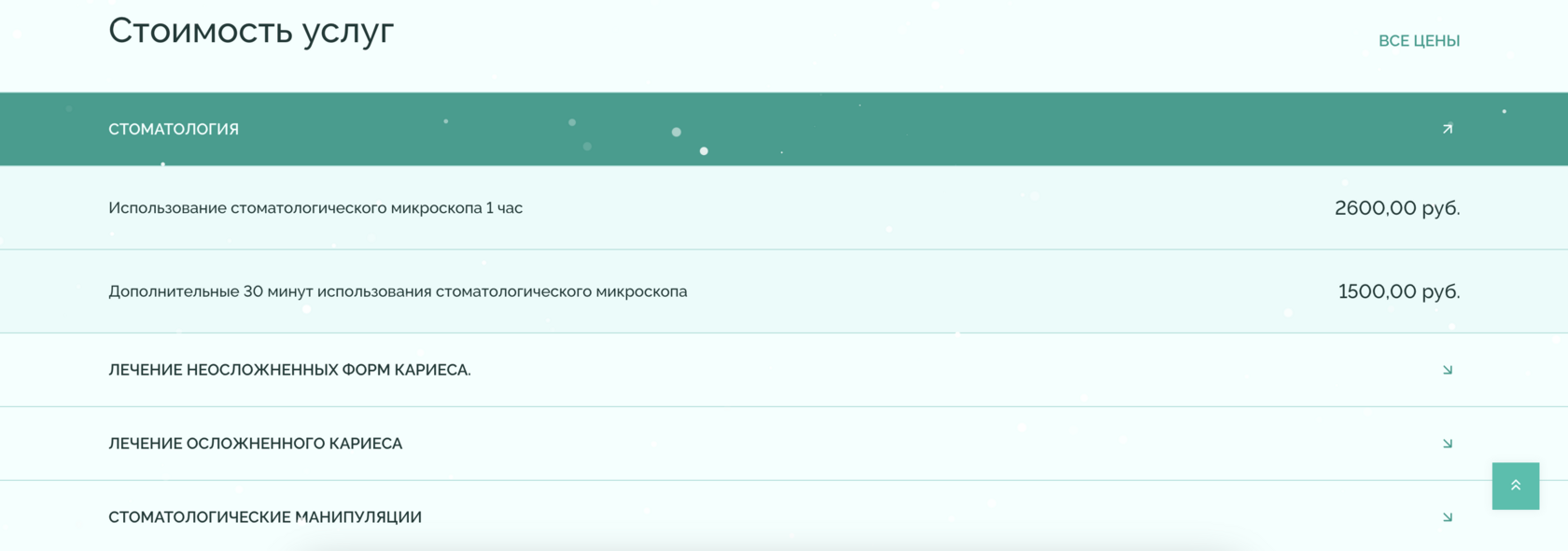 Также мы интегрировали актуальные цены из прайса клиники (которые заказчик размещает внутри своей МИС), чтобы пациенты всегда имели доступ к актуальным расценкам услуг.