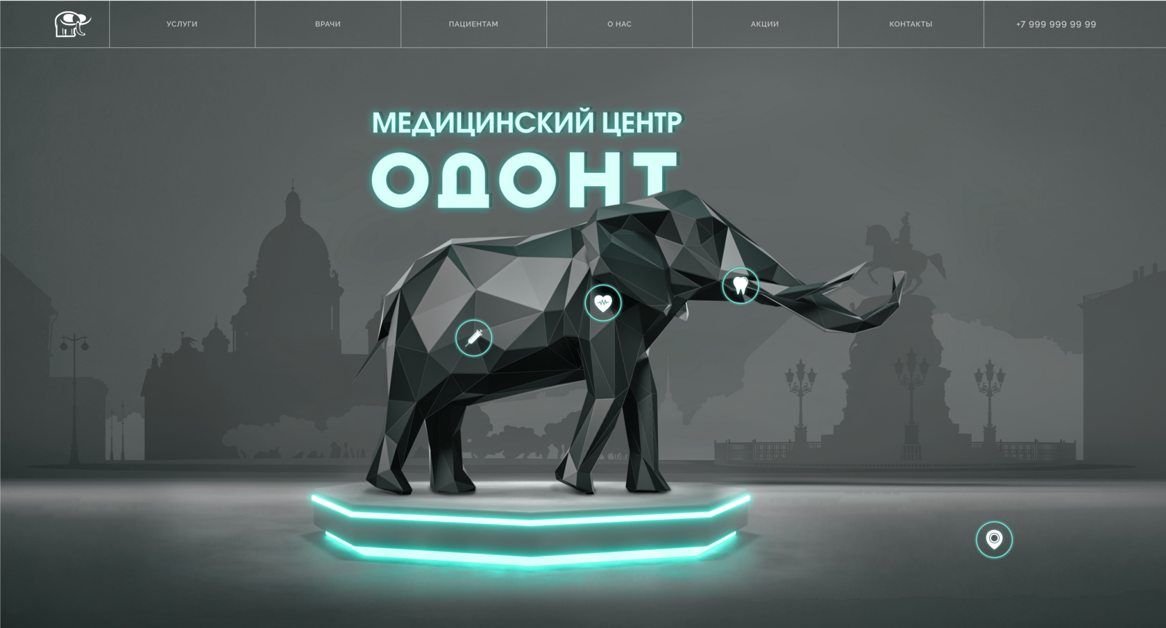 Кстати, одна из первых дизайн-концепций входа на сайт. Заказчик очень хотел слона при попадании на сайт и наша студия предложили креативное решение, которое смотрелось «дорого» или необычно. Образ забавного слоника из логотипа мы преобразовали в солидную фигуру слона, намекая сходством на многочисленные статуи и монументы Санкт-Петербурга, на которой разметили три подразделения клиники: амбулатория, стоматология и косметология.